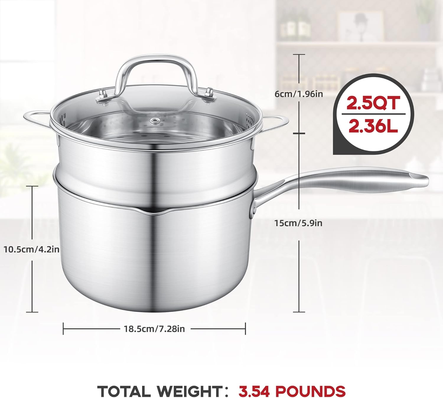 - Versatile Compatibility: The 2.5 QT stainless steel saucepan is compatible with all stovetops, including induction, gas, electric, and ceramic. Its tight-fitting lid ensures precise cooking control while allowing you to monitor your dishes as they reach perfection